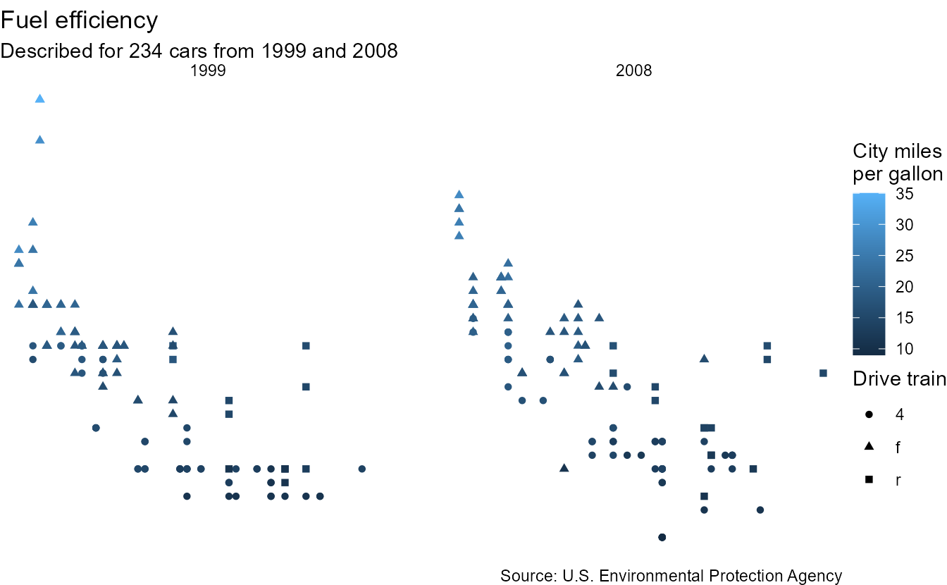 p <- ggplot(mpg, aes(displ, hwy, colour = cty, shape = drv)) +
