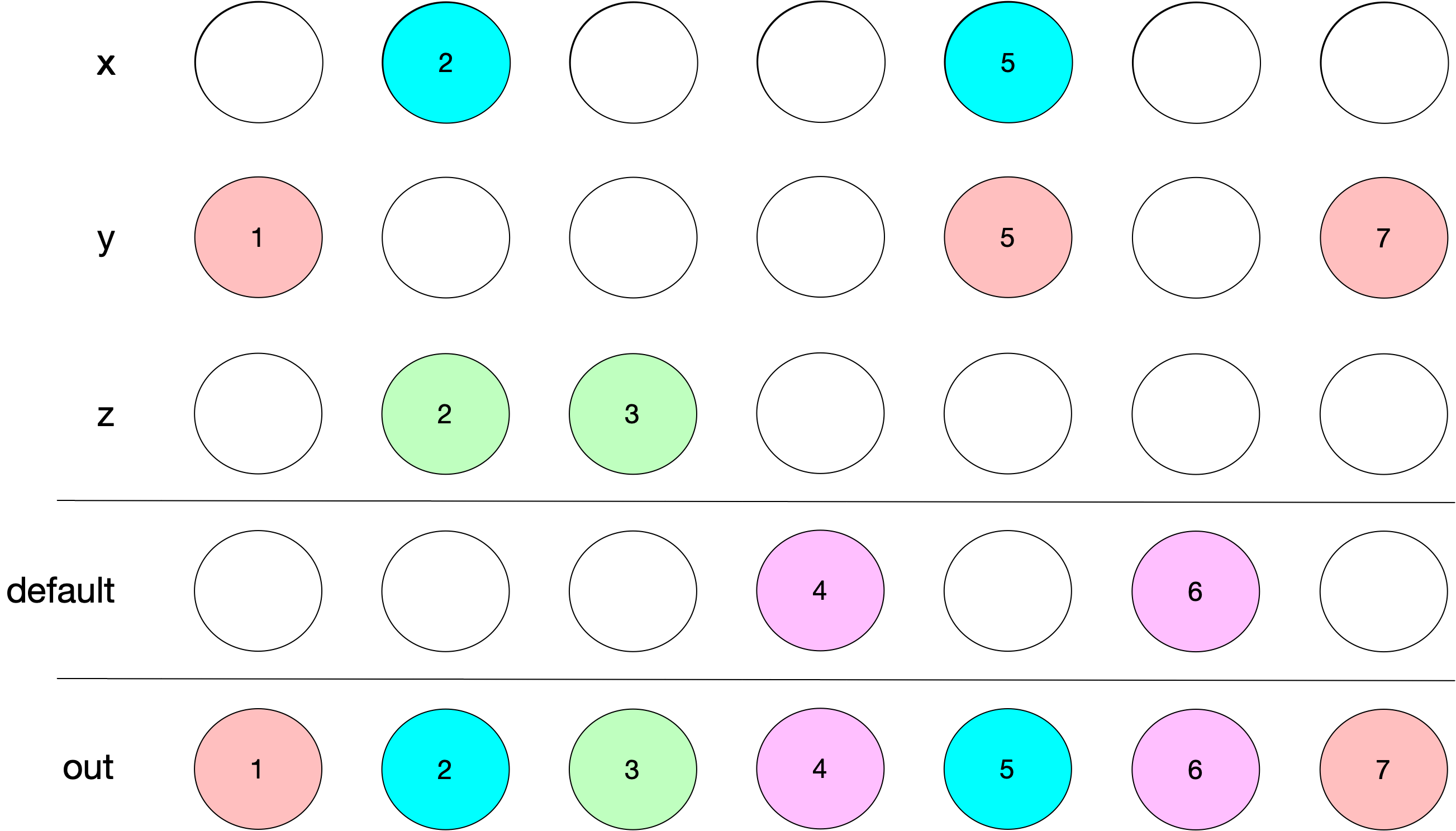 This already has the implied default assigned to every location. We then overwrite this with x, y, and z at the appropriate locations, but anything left untouched by those is still set to the default, so we’re done!