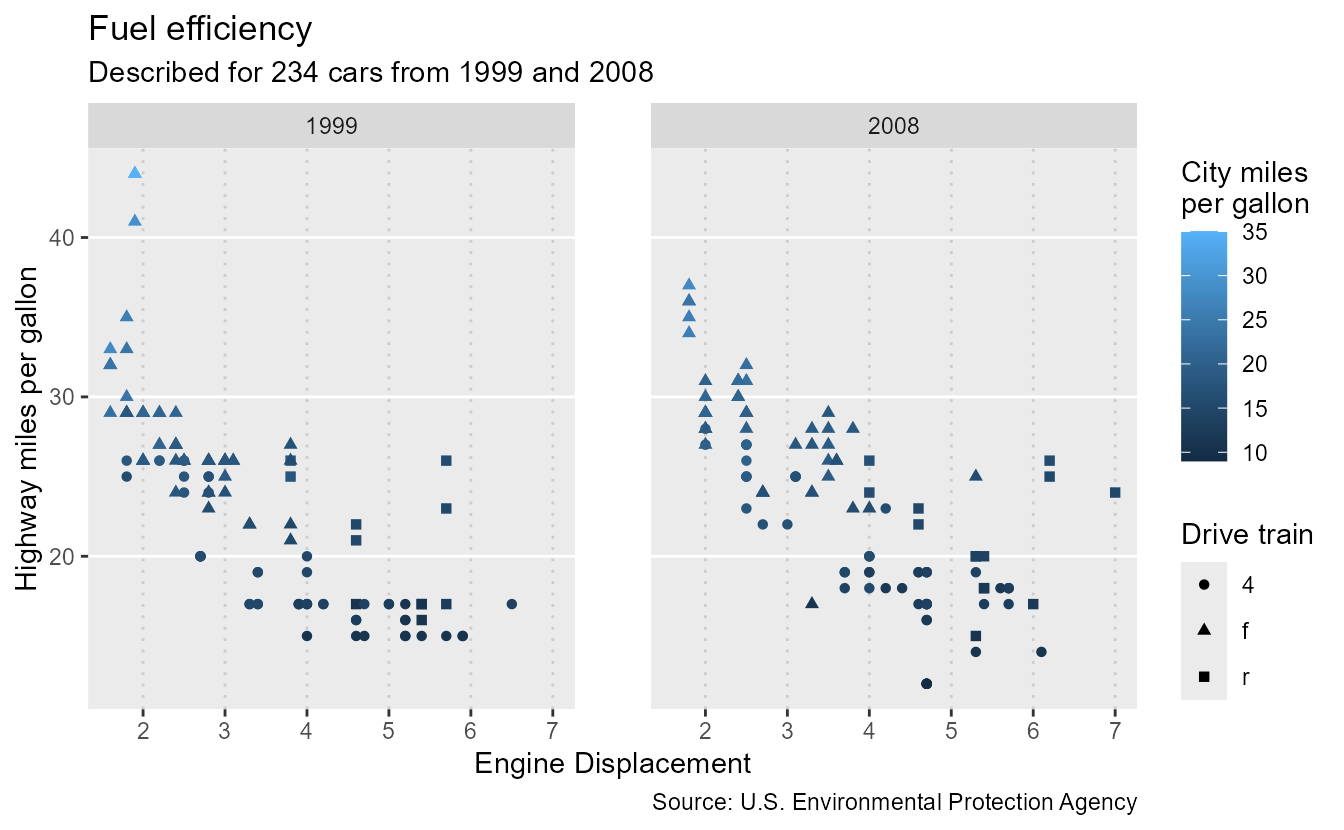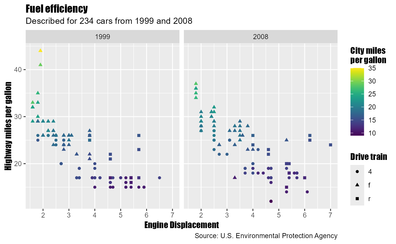 p <- ggplot(mpg, aes(displ, hwy, colour = cty, shape = drv)) +